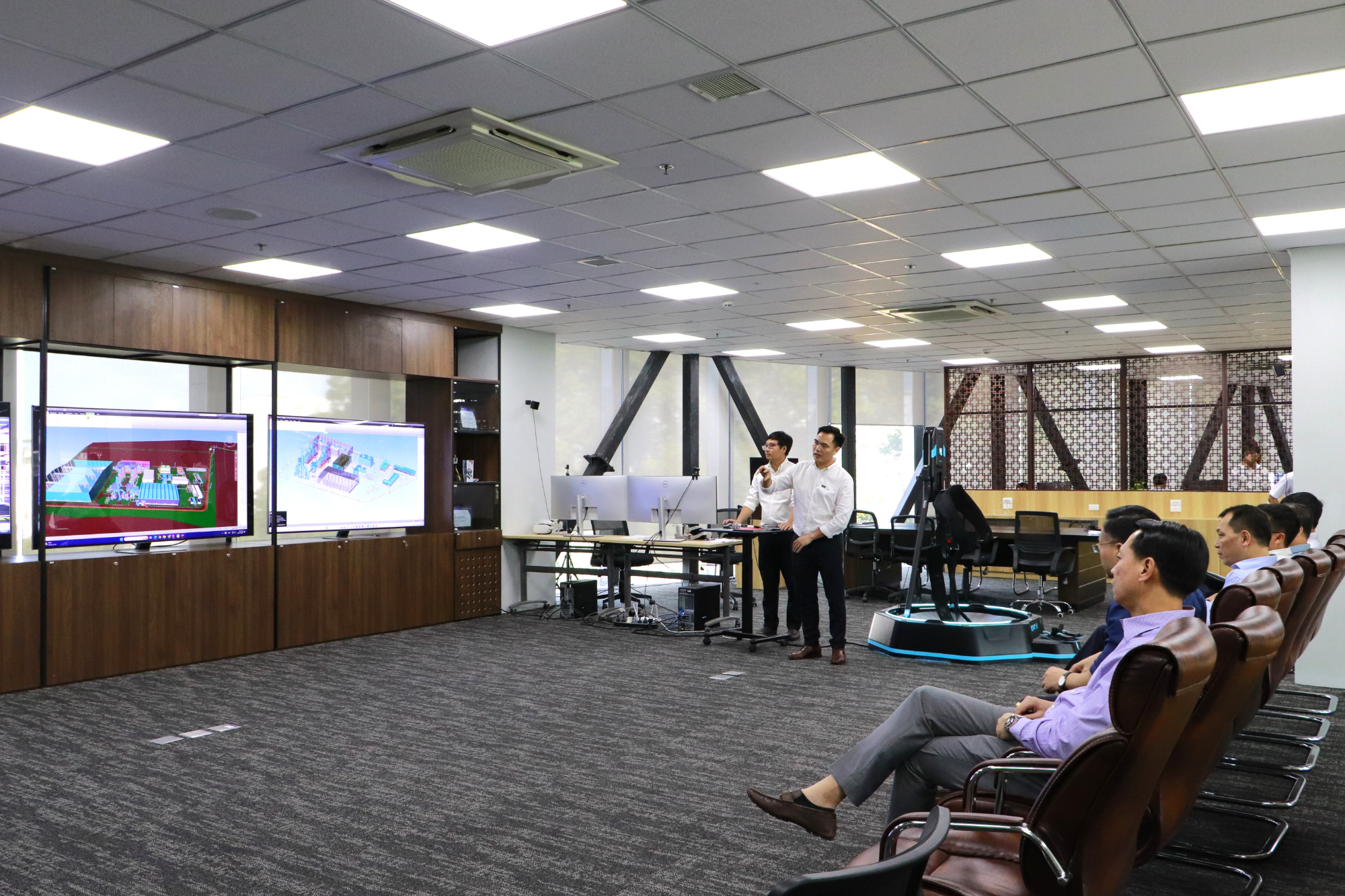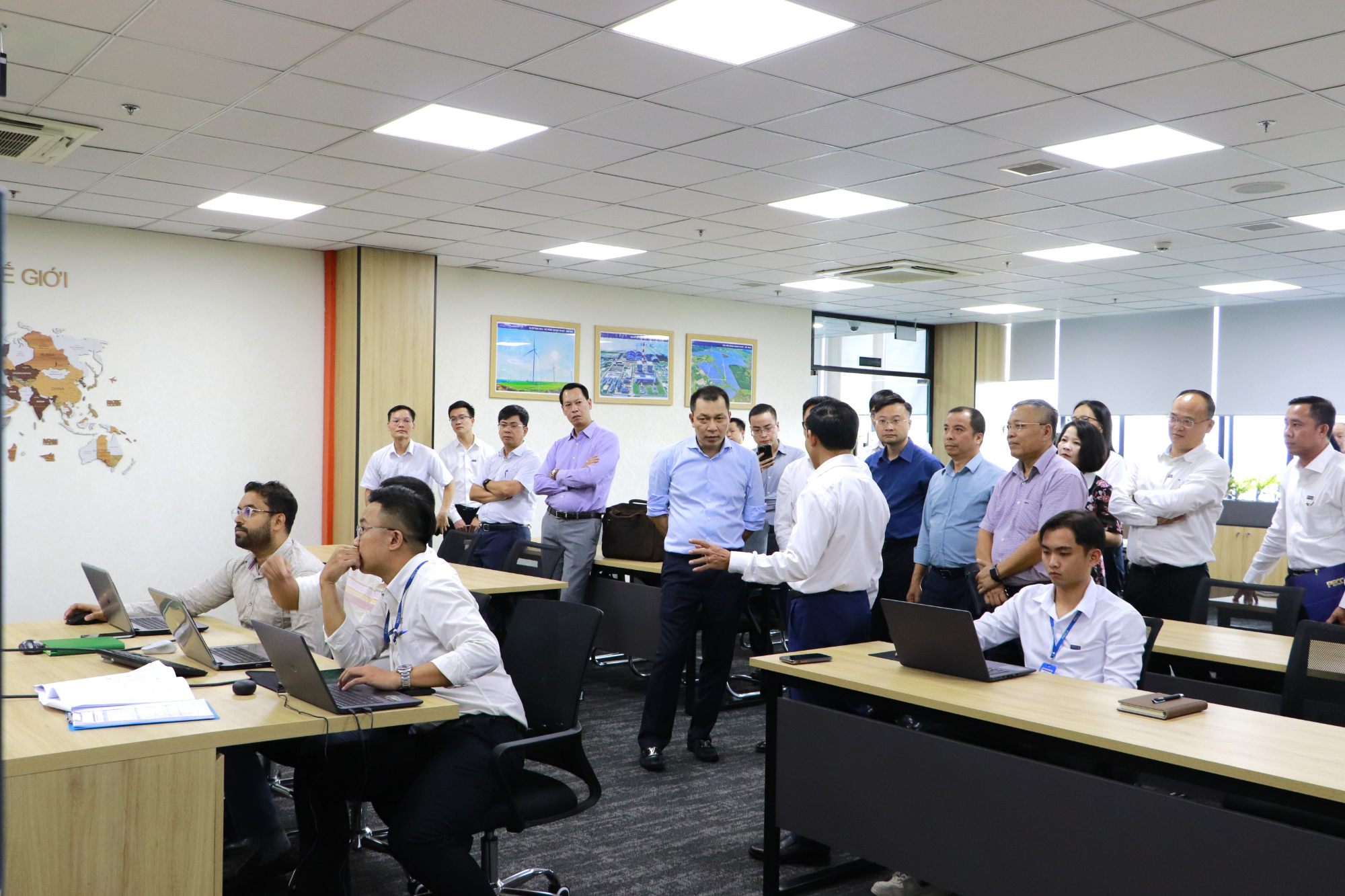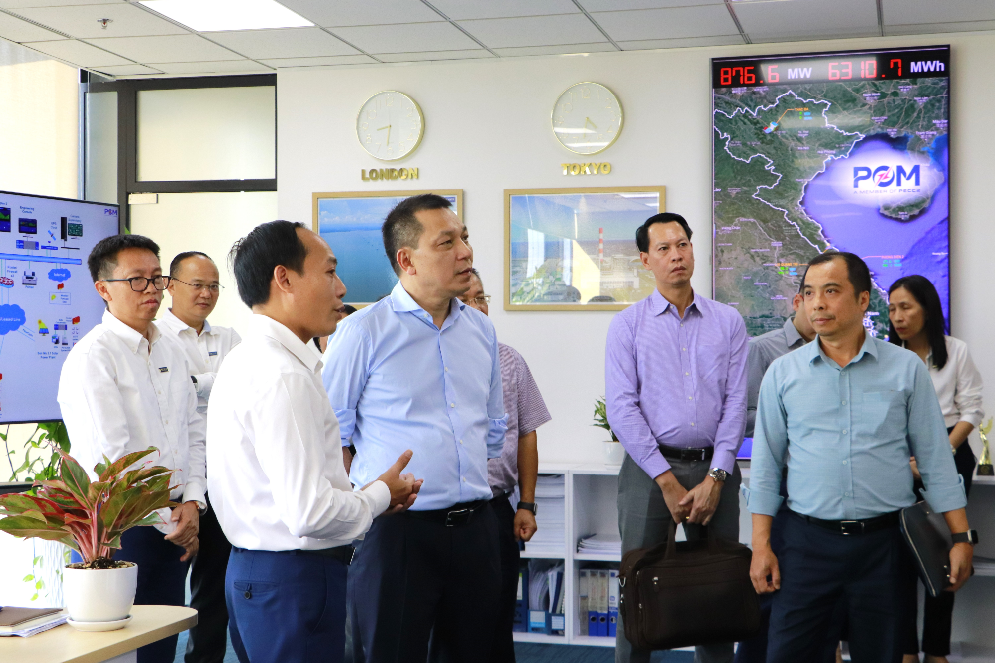 Chủ tịch HĐTV EVN cùng đoàn công tác đã nghe giới thiệu về tổng quan tòa nhà PECC2 Innovation Hub, hệ thống lưu trữ năng lượng BESS. Đoàn cũng đã đến thăm Trung tâm Vận hành nhà máy điện từ xa; Phòng đào tạo mô phỏng vận hành nhà máy điện (Simulator), Trung tâm năng lực số PECC2 – DCC.
