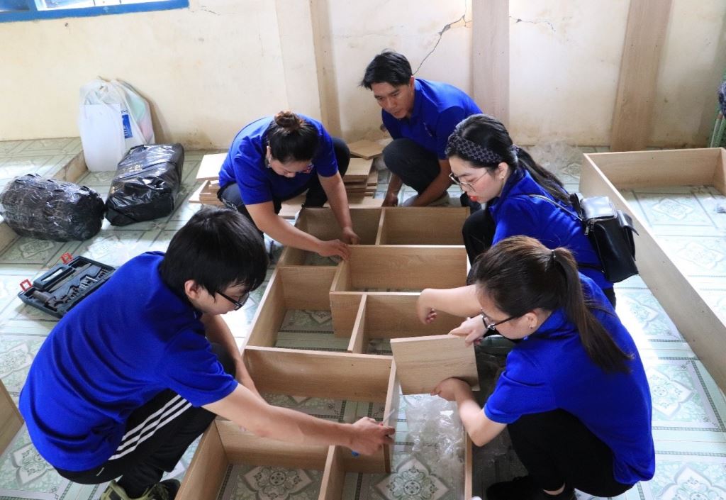 Theo phân công từ trước, một nhóm bắt đầu lắp ráp kệ sách, một nhóm dán giấy làm đẹp căn phòng, nhóm các bạn nữ phân loại sách truyện và nhóm còn lại thực hiện việc sơn quét lại cánh cổng trường.