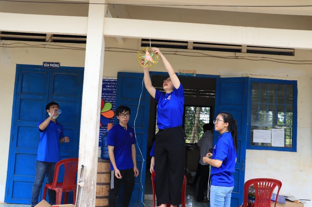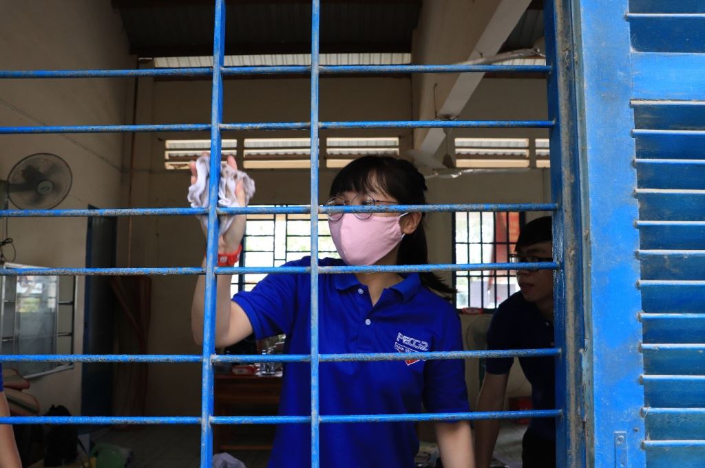 Sau khi nhận được sự đón tiếp và hướng dẫn của Ban giám hiệu nhà trường và Đoàn thanh niên Điện lực huyện Đức Huệ, cả đoàn nhanh chóng chuyển đồ đạc xuống xe và bắt tay ngay vào làm thư viện. Mục tiêu của Đoàn là biến căn phòng cũ đã xuống cấp trở thành một thư viện đầy ắp sách truyện cho các em học sinh. Trước mắt họ là căn phòng khá bừa bộn và phủ bụi do lâu ngày không có ai sử dụng. Nhưng tất cả những điều đó không khiến “đoàn áo xanh” PECC2 nao núng.