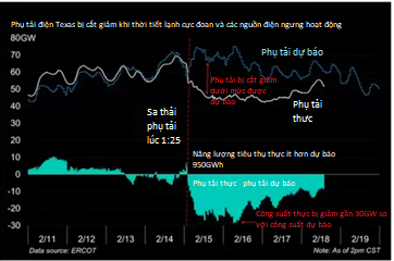 Hình 4: Diễn tiến của công suất tiêu thụ, công suất nguồn và tần số trong sự cố mất điện ở Texas (6)