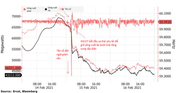 Vào khoảng 11 giờ đêm giờ địa phương vào Chủ nhật 14/2, một số nhà máy điện ở Texas bắt đầu bất ngờ ngưng hoạt động. Sau đó, vào khoảng 1 giờ 25 phút sáng ngày 15/2, dưới tác động của việc mất cân bằng cung cầu công suất đột ngột, tần số lưới điện giảm đột ngột từ 60 Hz xuống 59,3 Hz (6). Các chuyên gia lý giải rằng đây là thời điểm nhu cầu điện đã bắt đầu tăng cao (tương tự như sáng các ngày trước đó), trong khi đó nhiều nhà máy bị ngưng hoạt động bất ngờ và hệ thống nguồn không thể đáp ứng nhu cầu phụ tải kịp thời (3). Lúc này nhiệt độ thấp nhất ở Houston, Texas khoảng -10 độ C. Cùng thời gian này năm trước, nhiệt độ ở Houston là 6,7 độ C.