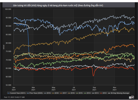 Hình 5: So sánh sản lượng khí đốt tự nhiên của 48 bang nước Mỹ giữa các năm – Sản lượng năm 2021 sụt giảm đột ngột gần 30% từ ngày 15/2/2021, theo Reuters (7)