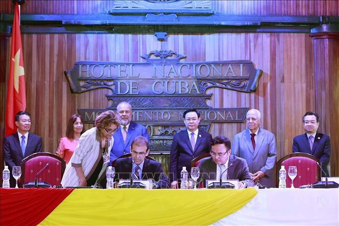 Chủ tịch Quốc hội Vương Đình Huệ và Thủ tướng Cộng hòa Cuba Manuel Marrero Cruz chứng kiến lễ ký giữa UNE, EVN và PECC2. (Ảnh: TTXVN)