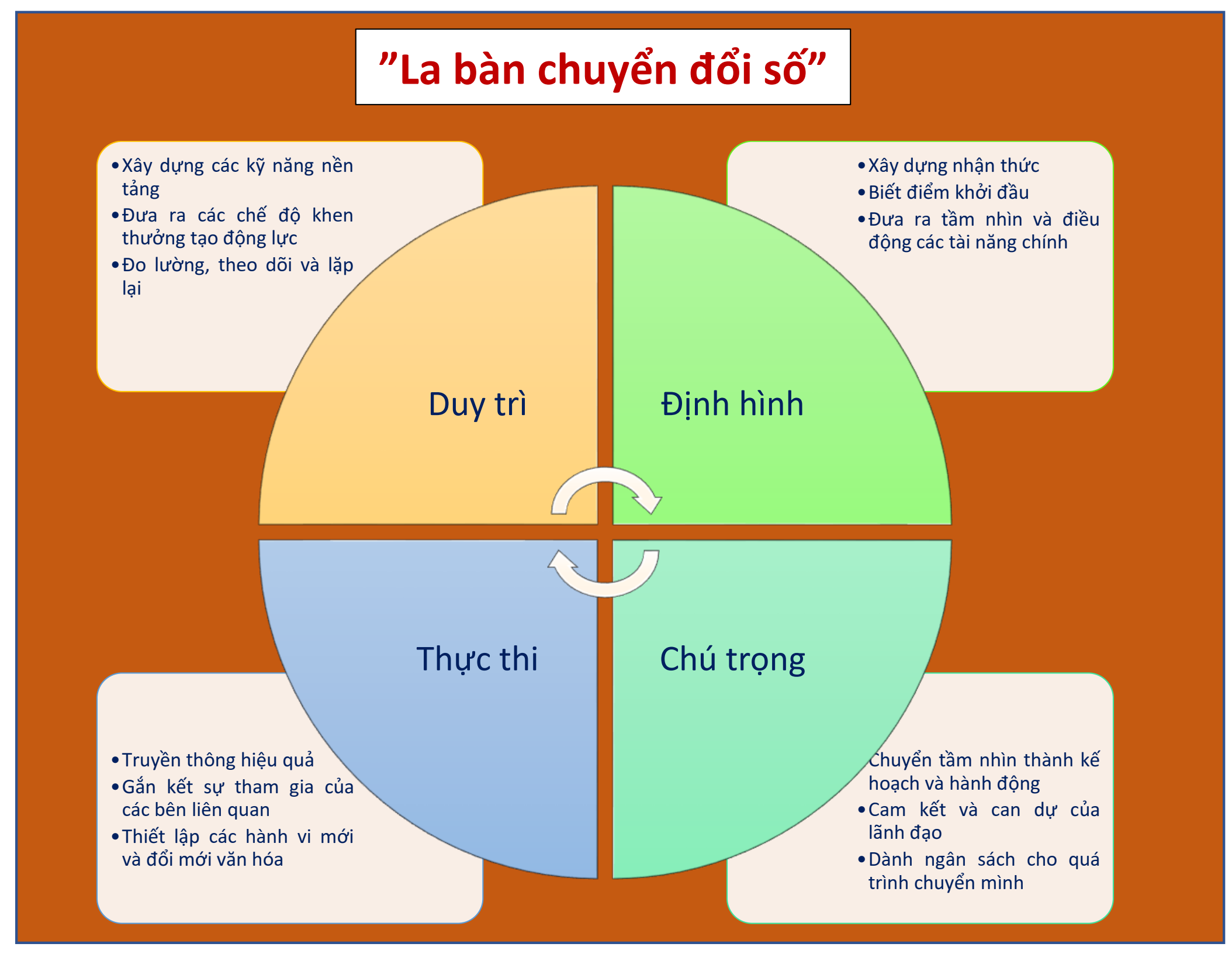 Để không bị chệch hướng, doanh nghiệp cũng cần trang bị cho mình một “La bàn chuyển đổi số”. Trong đó, phải quan tâm đồng thời bốn yếu tố trụ cột: Duy trì, định hình, thực thi, chú trọng.