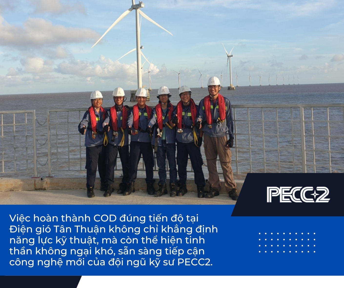 Năm 2021 được xem là dấu mốc quan trọng trong quá trình phát triển năng lực commissioning của PECC2 với Dự án Nhà máy Điện gió Tân Thuận giai đoạn 1 và giai đoạn 2. Khác với thông lệ phổ biến: nhà sản xuất turbine gió thường không cho phép đơn vị trong nước tham gia sâu vào commissioning; tuy nhiên, tại dự án này, thông qua quá trình thương thảo của lãnh đạo PECC2, đội ngũ kỹ sư đã được trực tiếp đào tạo và tham gia đầy đủ các bước commissioning turbine gió.