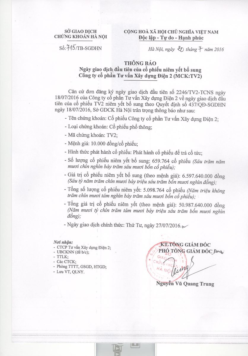 • Thông báo vv chấp thuận niêm yết cổ phiếu tại TV2 20/07/2016